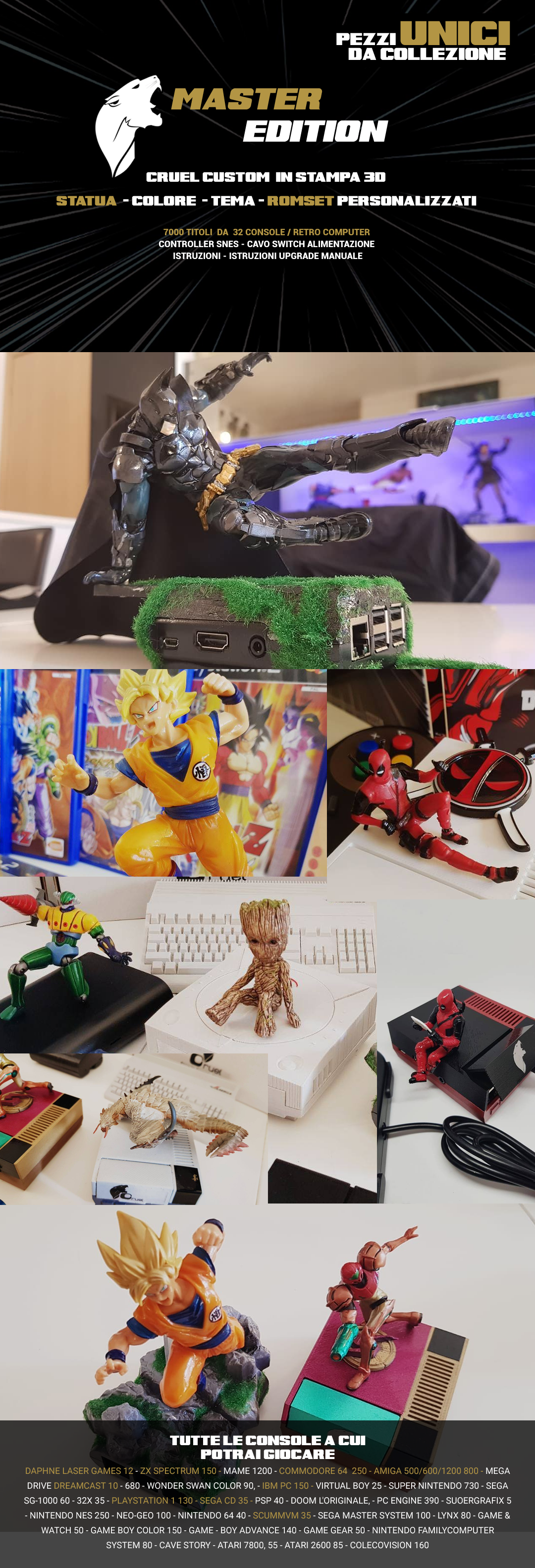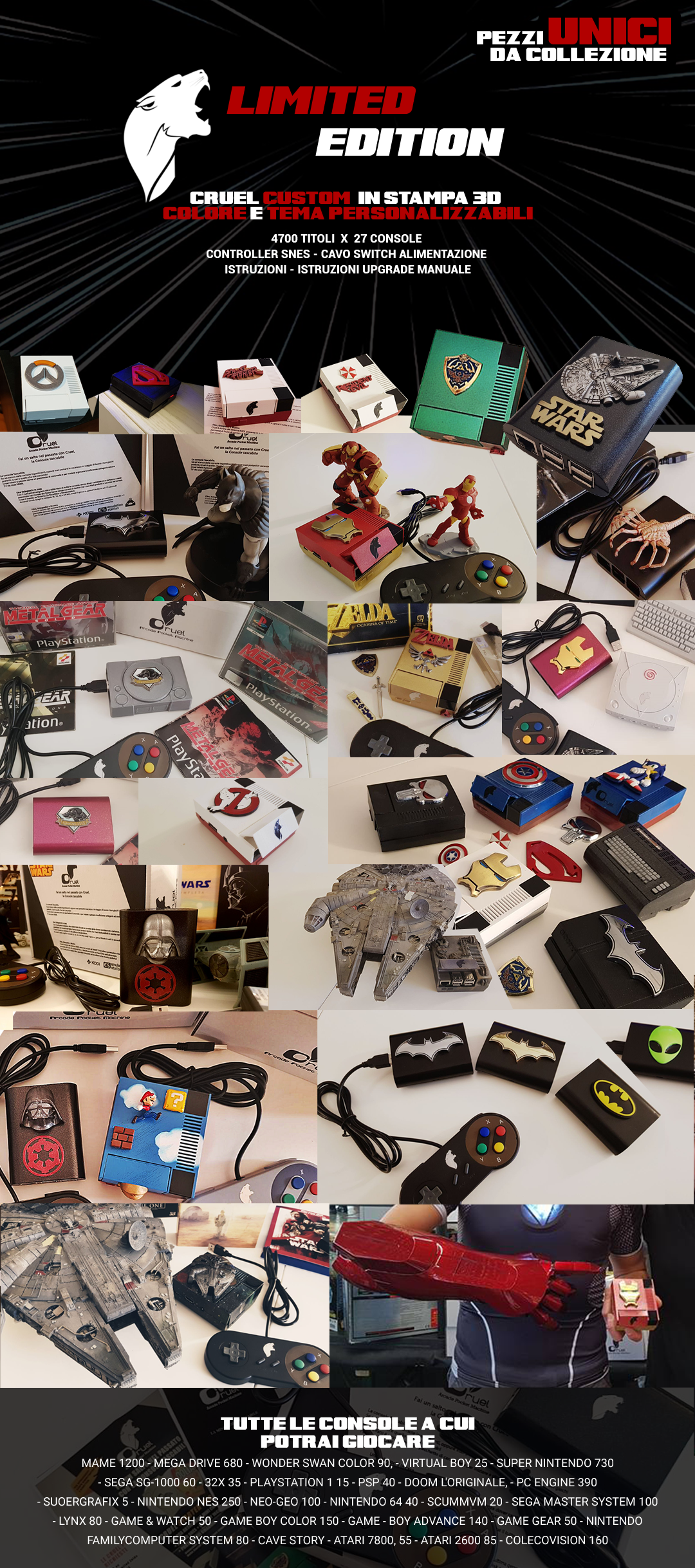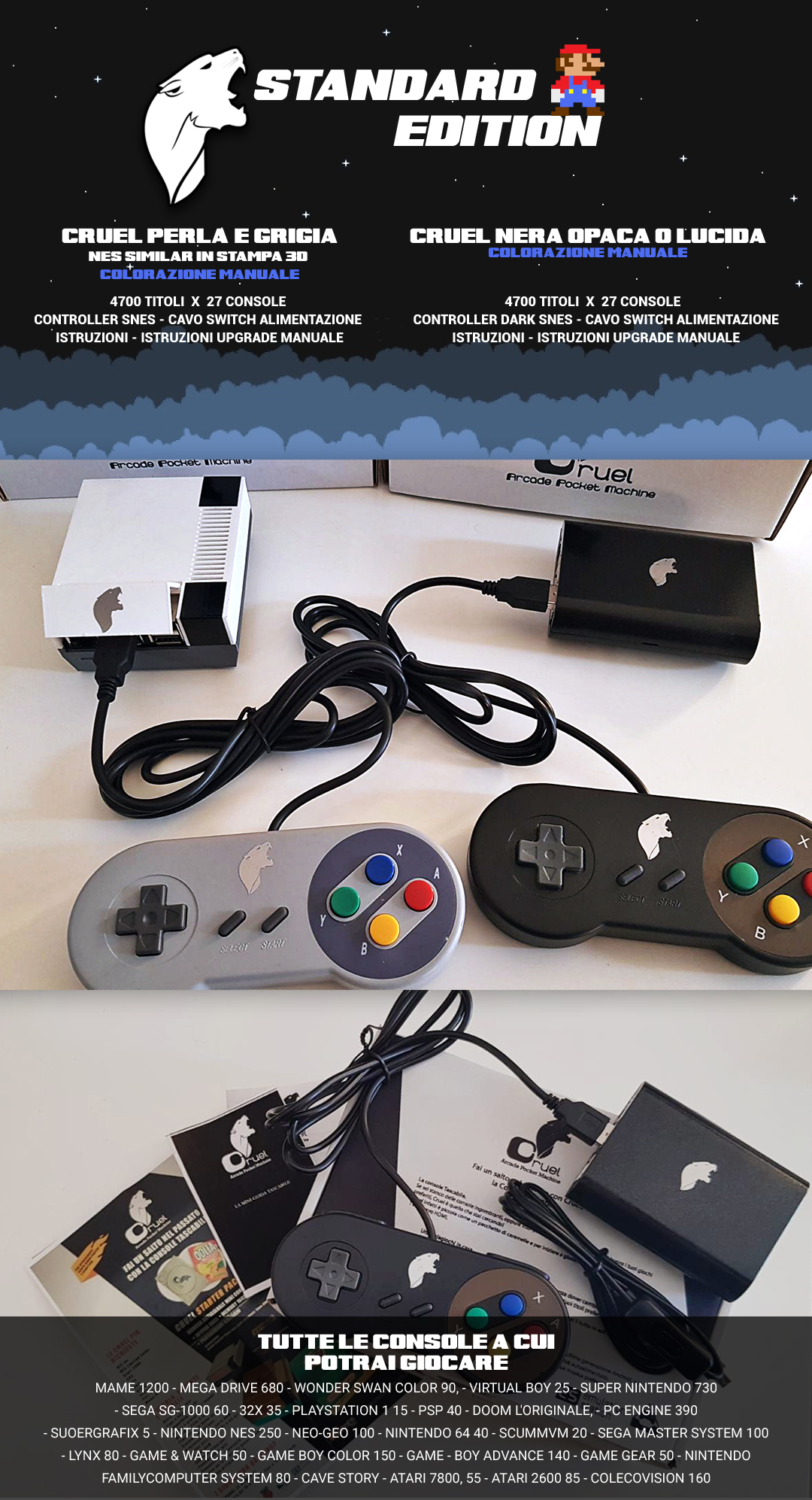 Cruela contiene oltre 6000 titoli di tutte le console, senza dover cambiare cd o cartucce, e sarai proiettato nel mondo dei RetroGame senza correre il rischio che i tuoi titoli preferiti si usurino nel tempo. Cruel è basato su Sistema Os RecallBox e Emulestation.
