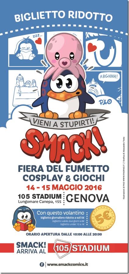 SMACK! – Fiera del Fumetto/Cosplay/Giochi di Genova è una festa che vede diversi eventi e protagonisti come gli stupefacenti cosplayers, autori Disney, Bonelli e di nuovi personaggi dei fumetti, mostre, fumetti per tutti i gusti, gadgets, giochi da tavola e games, le associazioni di costuming più importanti legati a Star Wars, film all’UCI Cinemas Fiumara con sconto con il biglietto di SMACK! e tantissimo altro ancora.